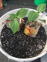 Tomatillos growing very fast with a nice root system so potted into fives. I put them in low greenhouse because next week it's supposed to get cold again. Tall greenhouse temperature up in high 90s on top shelf.