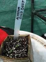 Dill and Alyssum sprouted in Greenhouse. Moved plants from west patio bed to east patio bed so I can fill and plant west patio bed.