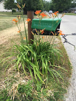 Kale and mustard doing quite well here. Lillies are blooming by mailbox. Daffodil foliage is brown. It looks like some sort of geranium has popped up by the mailbox.