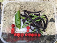 Interesting caterpillars on dill next to brussel sprouts. Volunteer cantaloupe still growing. Beans and chamomile are only giving a little. Harvesting tomatoes, ground cherries, and greens. I really enjoy the autumn joy pink sedum. It's easy to grow and the bees like it too. Late planted candula and erect marigold are growing. The erect marigold seems to be a very tough plant.